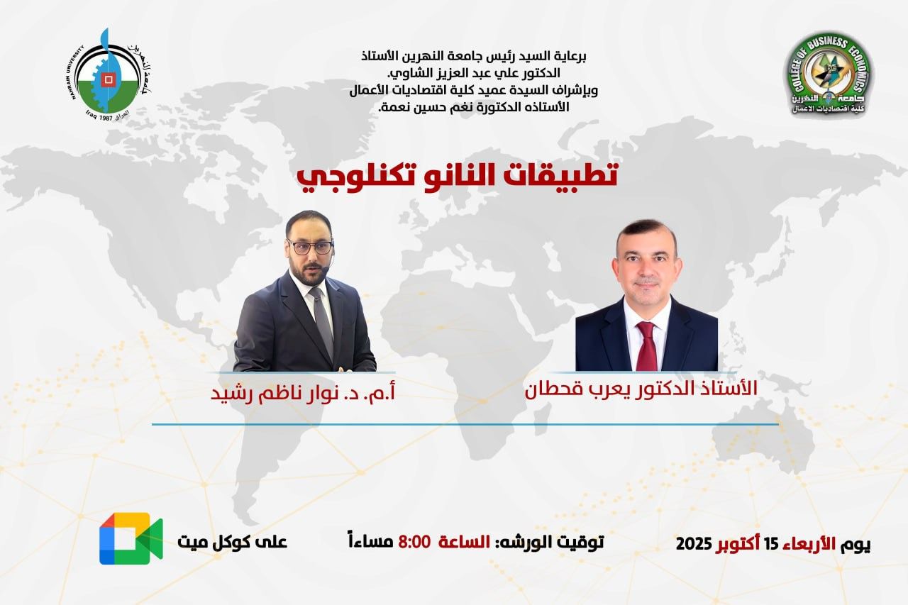 نظمت كلية اقتصاديات الأعمال في جامعة النهرين، بالتعاون مع مركز الأبحاث في جامعة جيهان – دهوك، ندوة علمية دولية (ويبنار) بعنوان “تقنيات النانو وتطبيقاتها وتأثيرها على الاقتصاد”، وذلك يوم الأربعاء الموافق 15 تشرين الأول 2025، بمشاركة أكثر من 100 باحث وأكاديمي من داخل العراق وخارجه، في خطوة تهدف إلى ربط البحث العلمي بالتنمية الاقتصادية المستدامة.