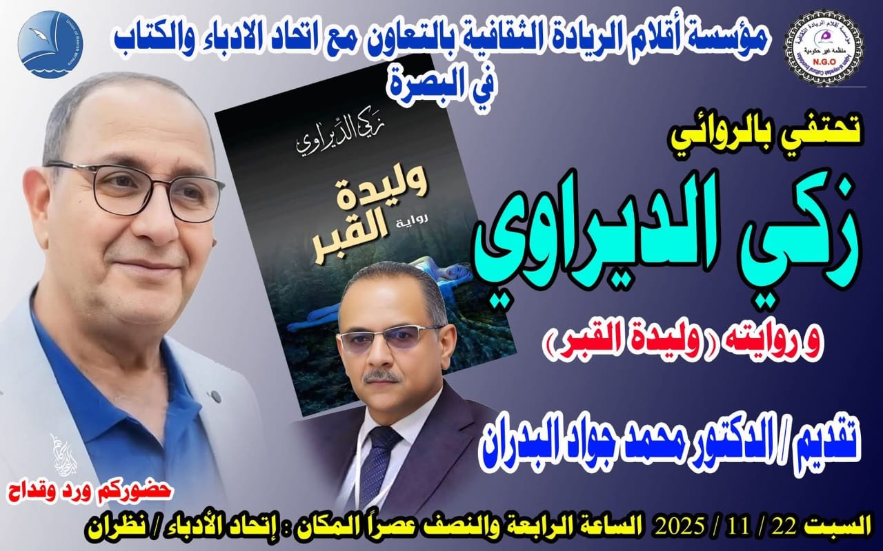 تحتفي مؤسسة أقلام الريادة الثقافية بالأديب زكي الديراوي لتوقيع روايته الجديدة[ وليدة القبر] حيث سيقدمه الاستاذ الدكتور محمد جواد حبيب البدران وذلك