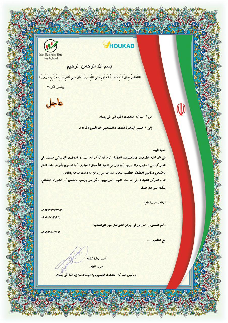 المركز التجاري الايراني في بغداد يؤكد استمرار نشاطه وتوفير خدمات الشحن للتجار العراقيين